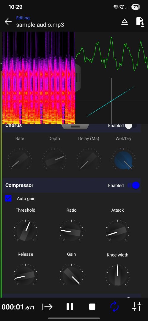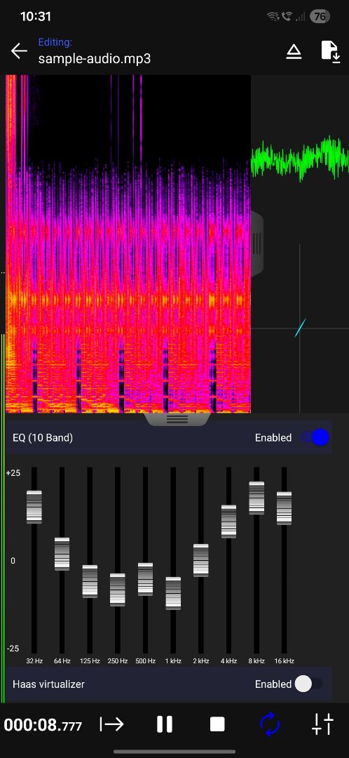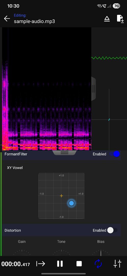 Some known issues: ● Files with sample rates other than 44.1 kHz are played back with altered speed and pitch. Reformat your files to 44.1 kHz to fix this "issue."; ● Some audio files may crash the app sometimes (Do not import large files and long lengths in general); ● Importing successive files in a row may create visual artifacts (sound meter, spectogram). For this reason, we have implemented a pseudo-eject audio method for each imported audio to avoid this issue (it reset the activity); ● The "seekTo" function may mute playback. Repeating the action restores the sound. Some filters may generate unwanted artifacts (rarely/not really case but can happen).