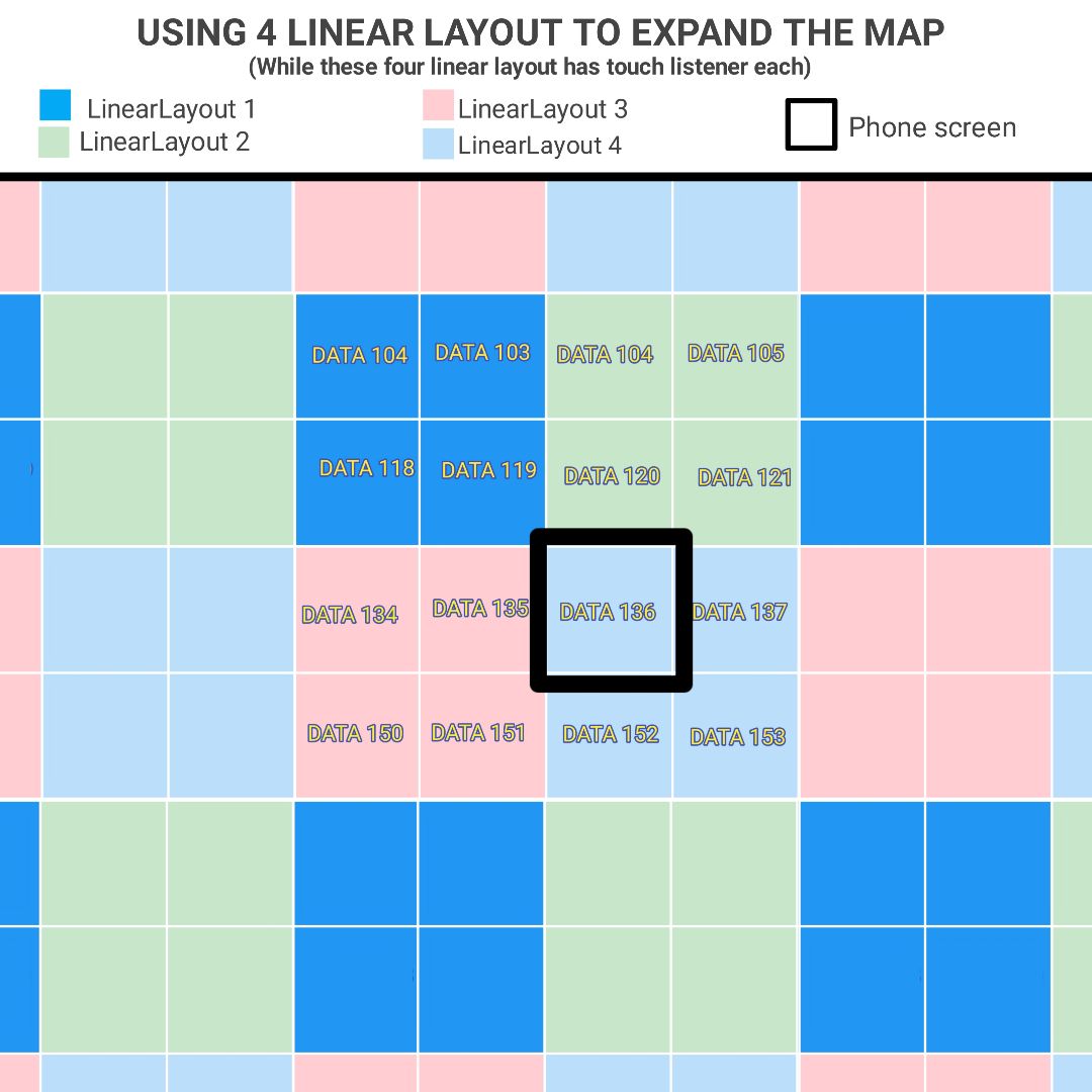 Because linearlayout has limit of its size, why not use four linearlayout to be reuse repeatedly to create Infinite scrolling?