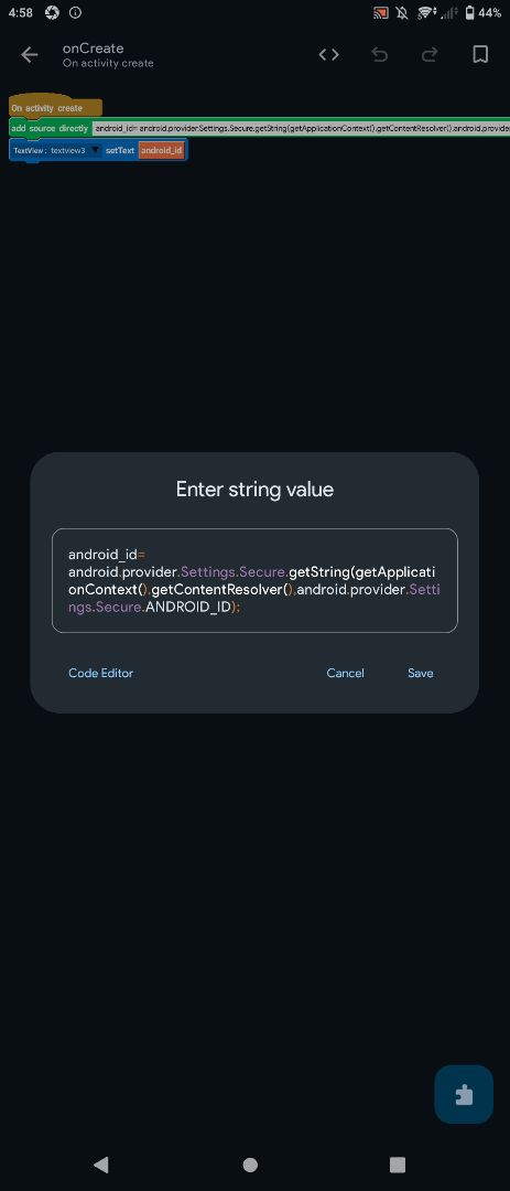 android_id= android.provider.Settings.Secure.getString(getApplicationContext().getContentResolver(),android.provider.Settings.Secure.ANDROID_ID);