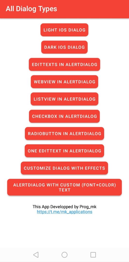 هذا المشروع يحتوي على العديد من أنواع الديالوجات المختلفة و المميز في هذا المشروع ان كل ديالوج منهم بدون أي (custom view) إنما بالكود فقط