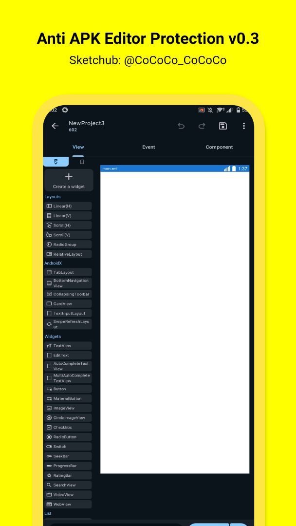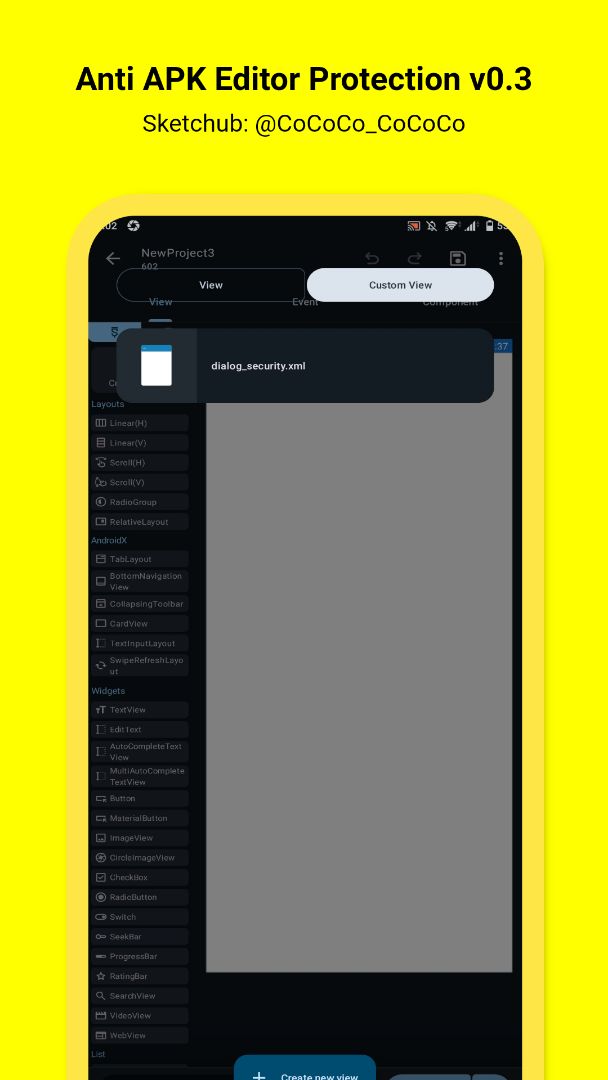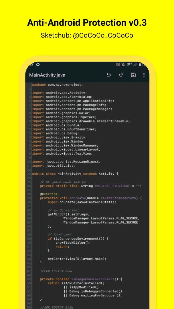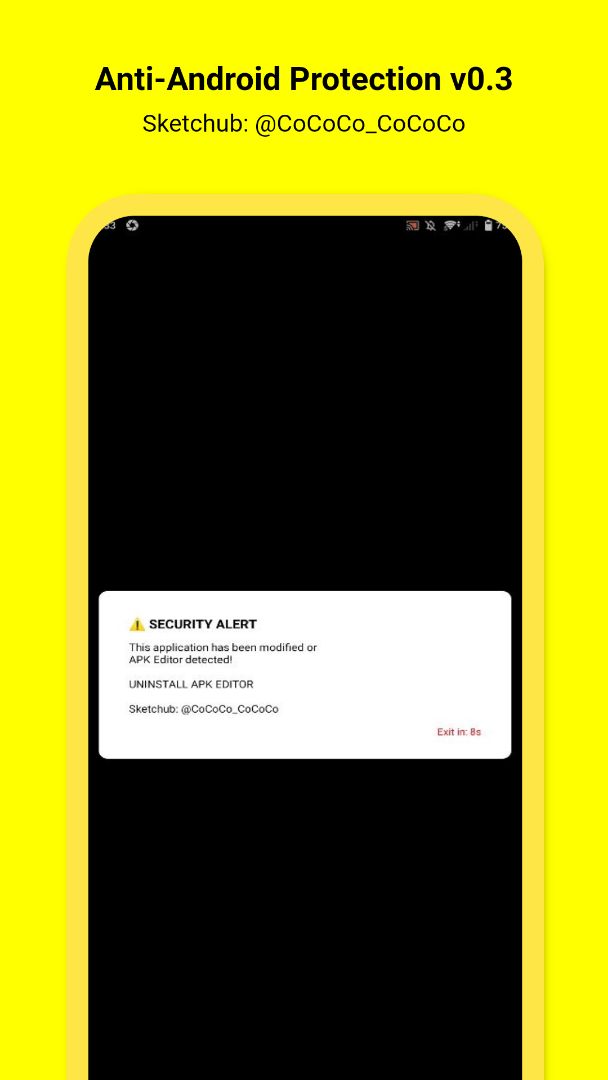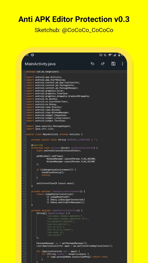 🔥 Protect the app from hacking and modification 🔥 Prevent re-signing 🔥 Scan for dangerous apps installed on the device 🔥 Verify the original app signature (SHA-256) 🔥 Debugger detection 🔥 Prevent the app from running if tampered with 🔥 Prevent screenshots 🔥 Display a warning message and close the app 🔥 Dialog circle radius (10dp) 🔥 Automatic exit timer after 10 seconds (10s) 🚫 The Exit button has been removed ✅ Use the latest version of Sketchware Pro. ✅ 100% bug-free project.