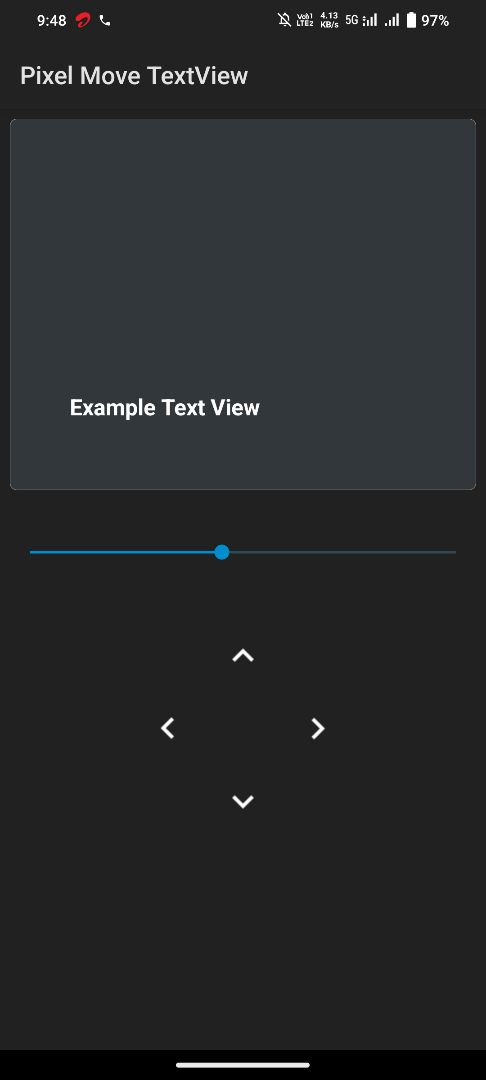 PixelPositioner is a simple Android app that allows users to manipulate the position of a TextView on the screen using buttons and a SeekBar. With PixelPositioner, you can move a TextView left, right, up, or down by a specified number of pixels with just a tap of a button. Additionally, the SeekBar lets you fine-tune the TextView's position dynamically, providing precise control over its placement on the screen. This app is a handy tool for experimenting with pixel-level positioning and understanding how Android views can be manipulated programmatically.