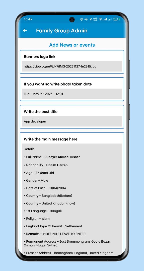 • Add your family members • Edit family members • Send Notification • Post your family news or any memorable events • Edit everything • Send Up to 10 image every post • Auto send notification to all when upload a post • And many more features