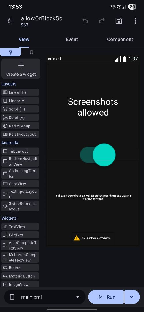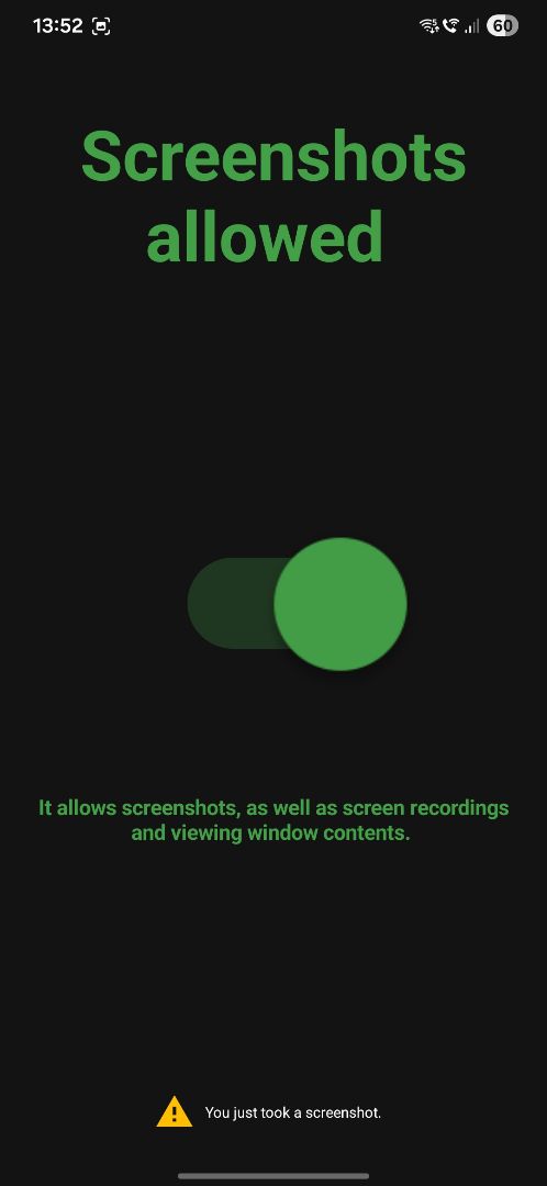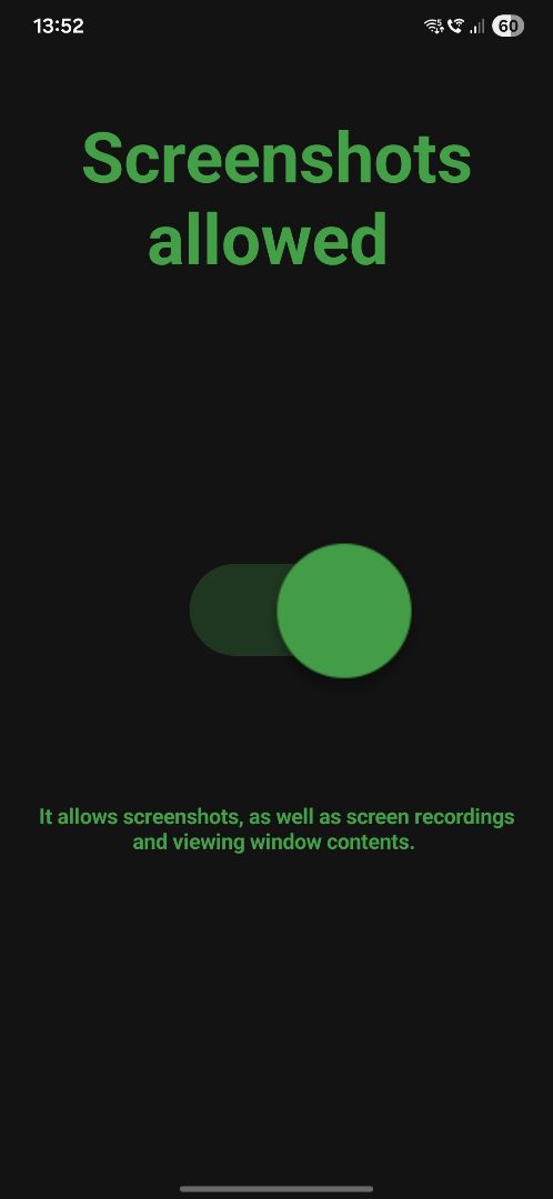 This project demonstrates toggling to allow or restrict screenshot/screen recording, including window content preview (Recent Apps).