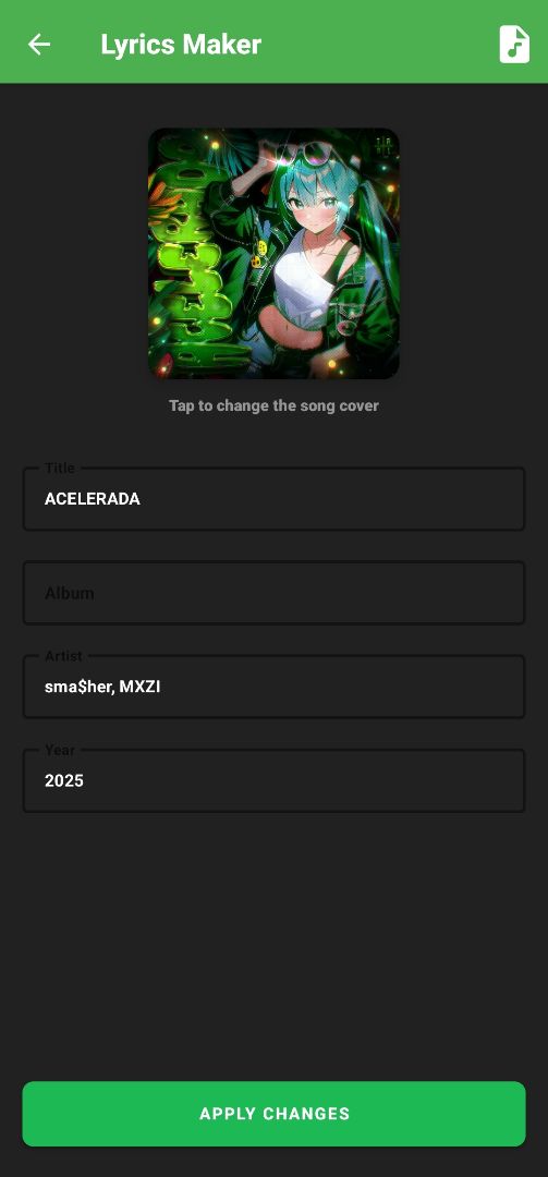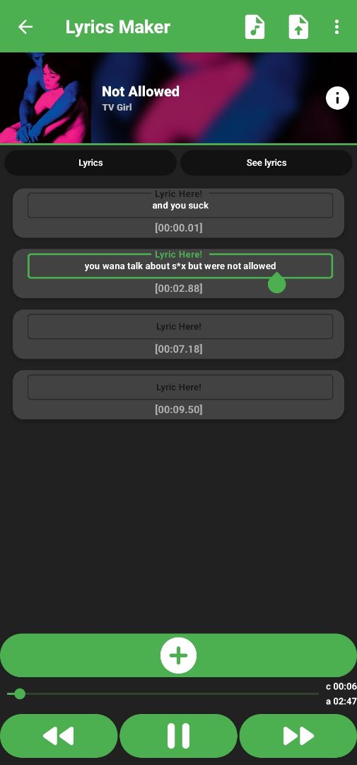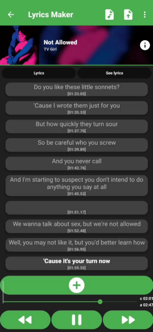 Lyrics Maker lets you add lyrics to any song. Upload your music, type the lyrics, and export as a .lrc file to share.