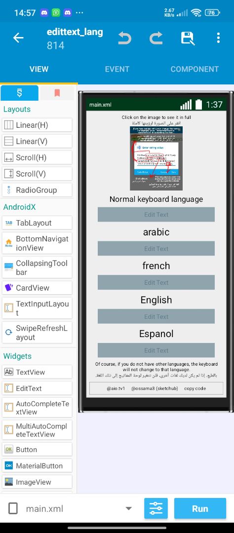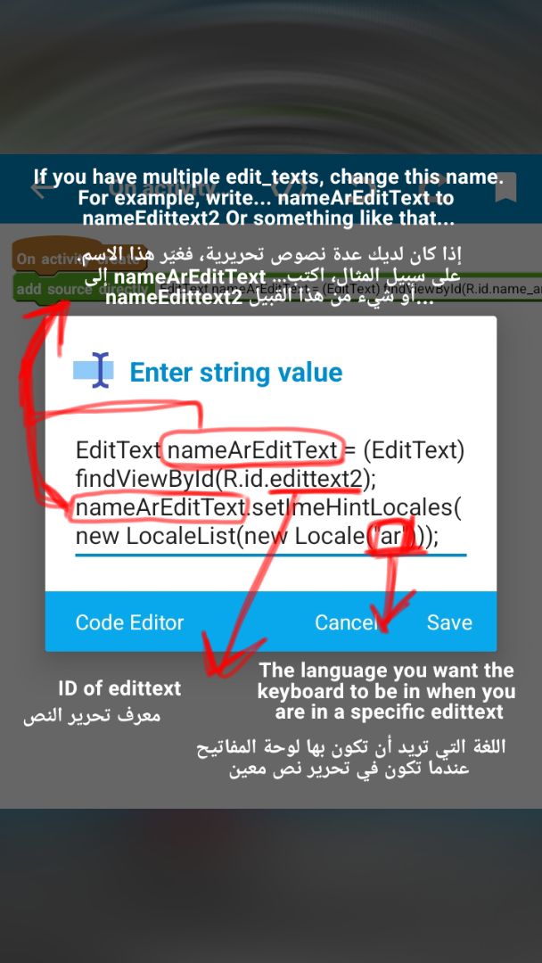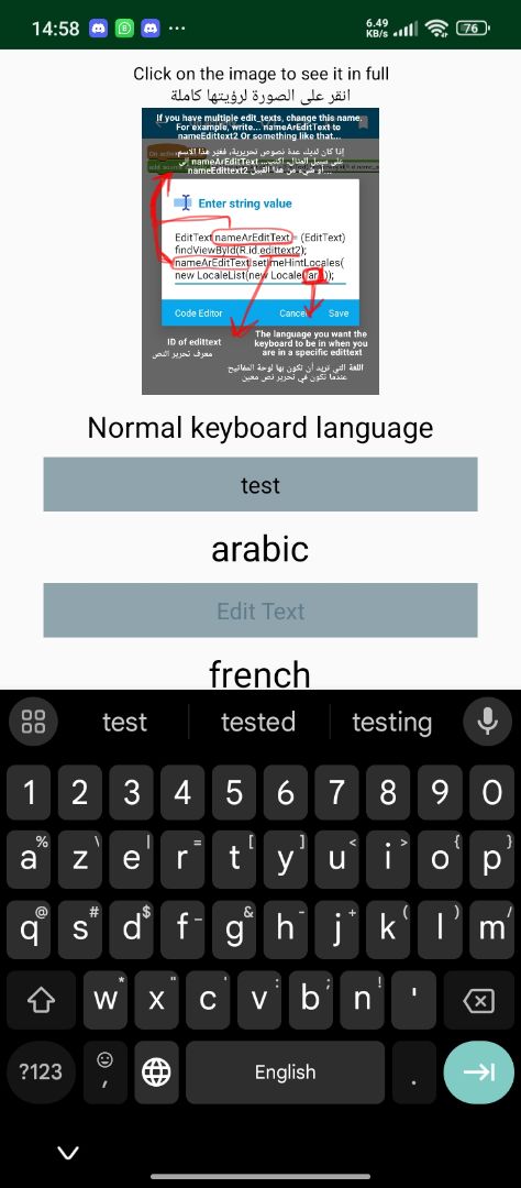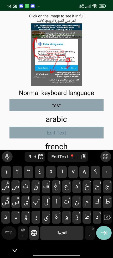 When you are in a specific "edit text" and you want to set it in Arabic or any other language on the keyboard عندما تكون في "edittext" محدد وتريد ضبطه باللغة العربية أو أي لغة أخرى على لوحة المفاتيح