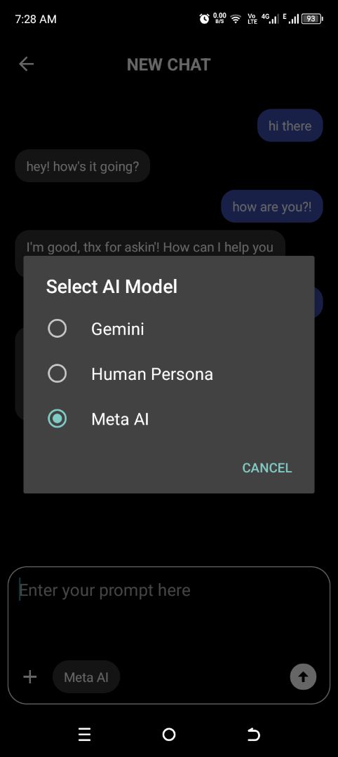 Features: 🤖 Multi-AI: Switch between Gemini, Meta AI, and Human Persona. 🧠 Smart Memory: All AIs remember your conversation for better replies. 💾 Chat History: Automatically saves and loads your past chats. ✨ Sleek UI: Clean, dark, and easy to use. !! IMPORTANT !!