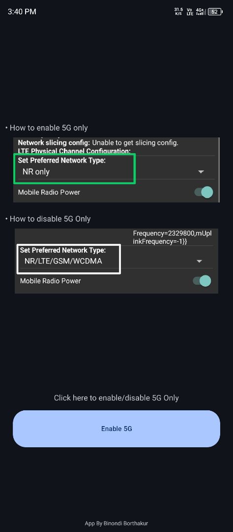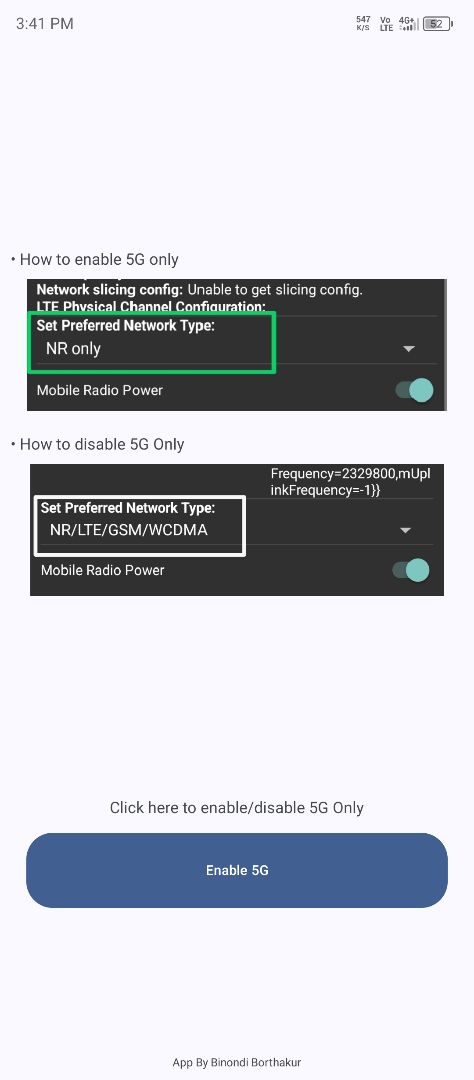 Steps to enable 5G • Click on the button given in the app. • Select NR Only network. • Done, now your phone will only receive 5G net.