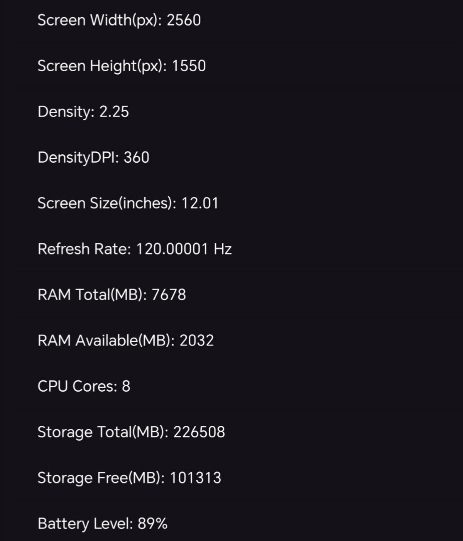 ๐น Screen Specifications: Presents screen metrics including Screen Width, Screen Height, Density, DensityDPI, Screen Size (inches), and Refresh Rate.