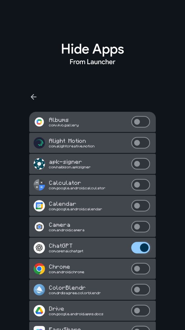 ⚡ Features • Hide Apps • Show Package Name • Search Apps By Package name • Multiple Languages (Automatic By System)