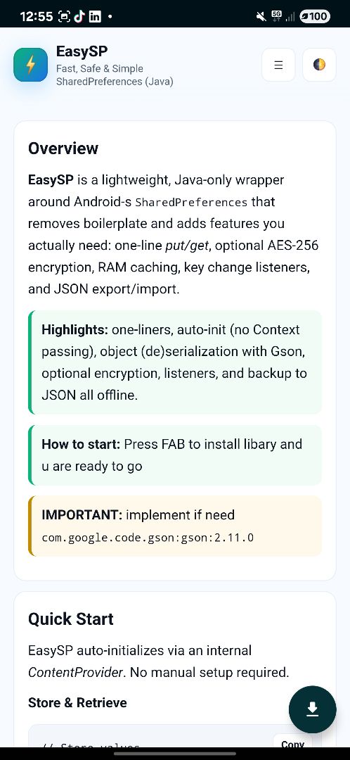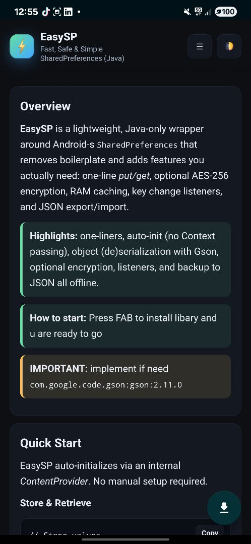 EasySP is a lightweight, open-source SharedPreferences wrapper for Android written entirely in Java. It simplifies data storage with one-line put() and get() methods, automatic initialization, and blazing-fast in-memory caching β all without context passing.