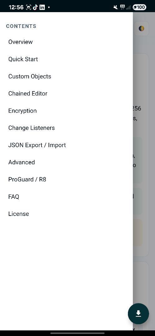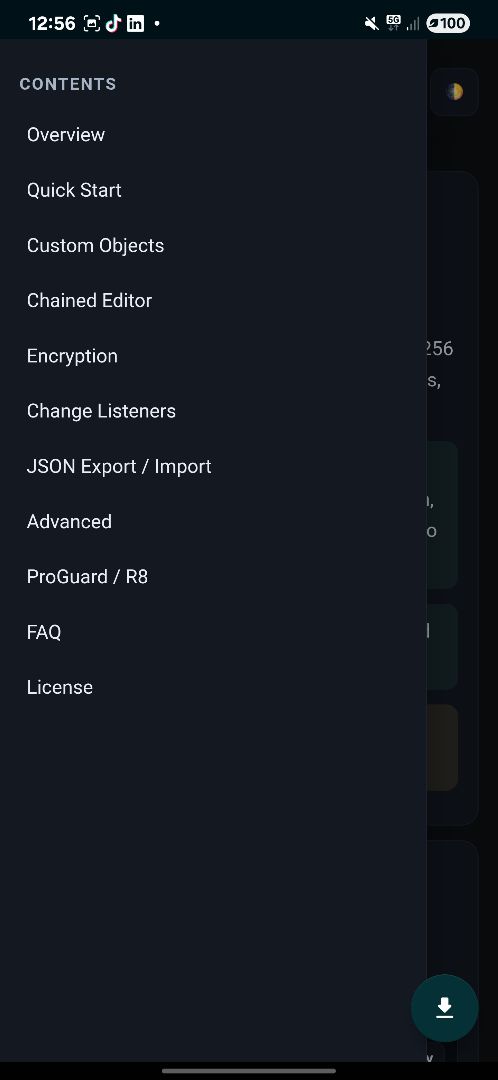 Key Features: β‘ One-line get/put π AES-256 Encryption π§ Object Serialization (Gson) πͺΆ Lightweight & Offline π JSON Export/Import π Live Key Listeners βοΈ Memory Caching