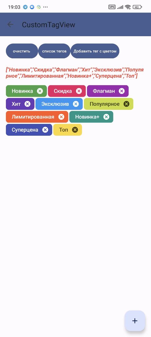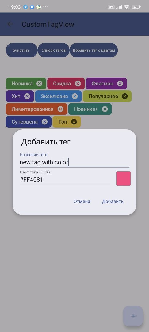 tagGroupView.addTag(new Tag("Android", Color.BLUE)); tagGroupView.setTextColor(Color.WHITE); tagGroupView.setBackgroundColor(Color.DKGRAY); tagGroupView.setCornerSize(16f); tagGroupView.setClosable(true);