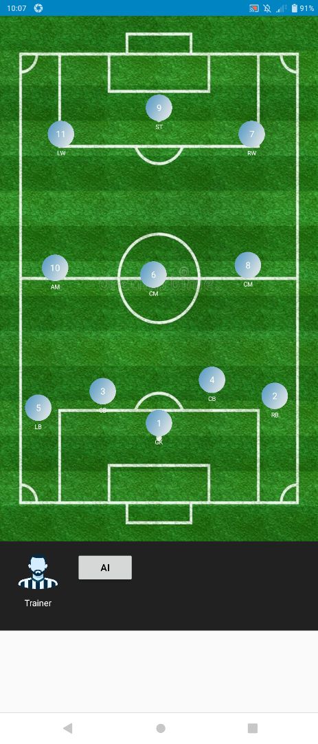 A complete football pitch with 11 players positioned according to their roles: Each player is represented by a circle containing their number and position on the field.