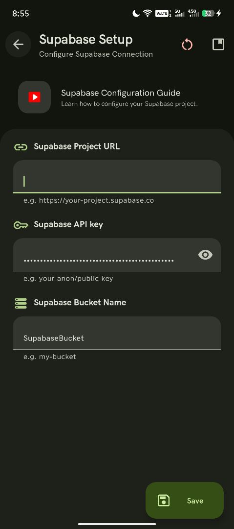 SupaStorage - Supabase Image Uploader A simple and elegant Android app for uploading images to Supabase Storage with real-time progress tracking. Features: 📤 Batch upload multiple images at once 📊 Real-time progress bar with percentage tracking 🎨 Modern Material Design 3 interface 🔧 Easy Supabase configuration ⚡ Automatic image compression (1024px) 🗑️ Manage upload queue - remove or clear images How it works: Configure Supabase credentials (URL, API Key, Bucket) Select images from your device Review selected images Upload and track progress Images saved to your Supabase Storage Tech Stack: Built with Sketchware Pro v7.0.0, Material Design 3, ViewBinding, RecyclerView, Supabase REST API, and edge-to-edge layout support. Requirements: Active Supabase project with Storage enabled Created storage bucket API key with storage permissions Perfect for: Developers and users who need a quick, code-free way to upload images to Supabase Storage. Lightweight utility app with smooth animations and intuitive UI. Note: This is a personal project built for learning and practical use. Not affiliated with Supabase.