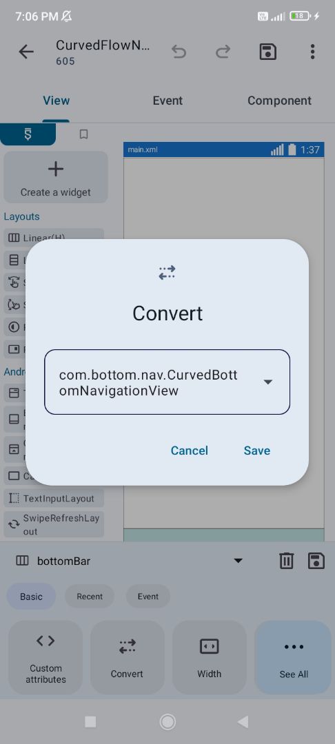 Convert Class: Convert your Bottom Bar (Linear) to your full package path: [your.package.name].CurvedBottomNavigationView (Example: com.my.app.CurvedBottomNavigationView).