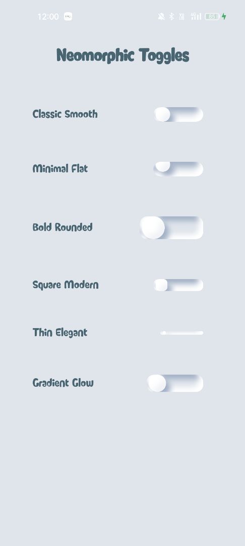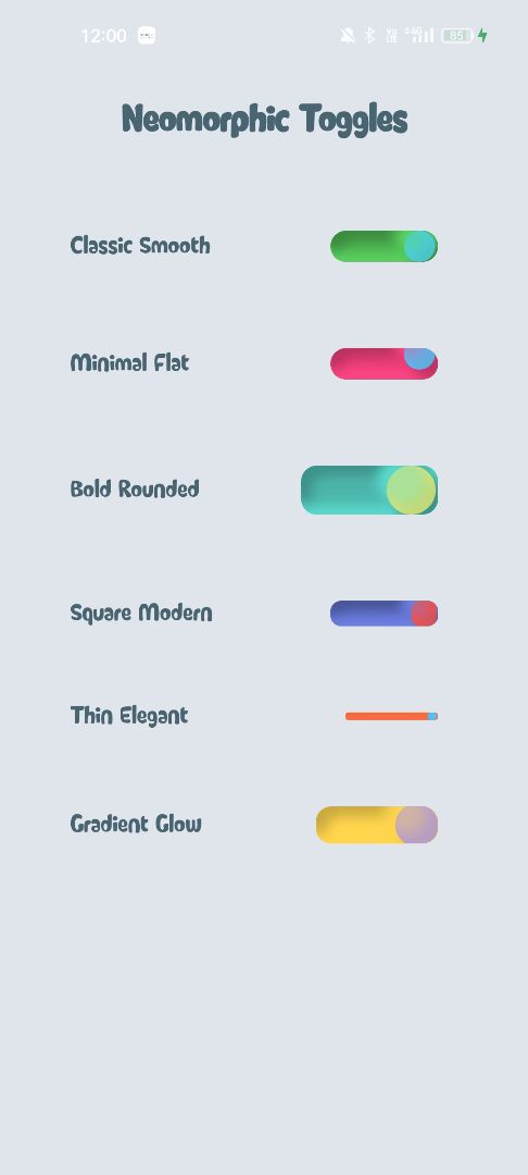 · 7 Distinct Animation Styles · Rotate: 360-degree knob rotation with smooth acceleration · Jump: Vertical bounce effect with natural gravity simulation · Bounce: Playful spring-like motion at the endpoint · Pulse: Gentle scaling animation for subtle emphasis · Neon: Glow effect with overshoot interpolation for dramatic visuals · Scale: Proportional size transformation during state change · Flip: 3D-style rotation for a card-flip illusion · Complete Visual Customization · Custom colors for both active and inactive states · Automatic shadow generation based on primary color selection · Adjustable corner radius for square, rounded, or circular designs · Real-time color interpolation during state transitions