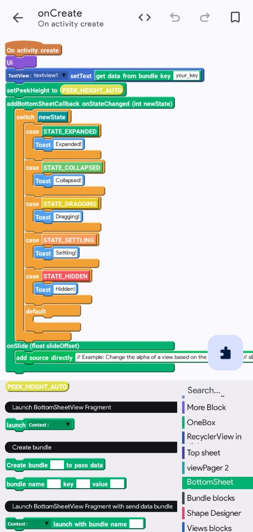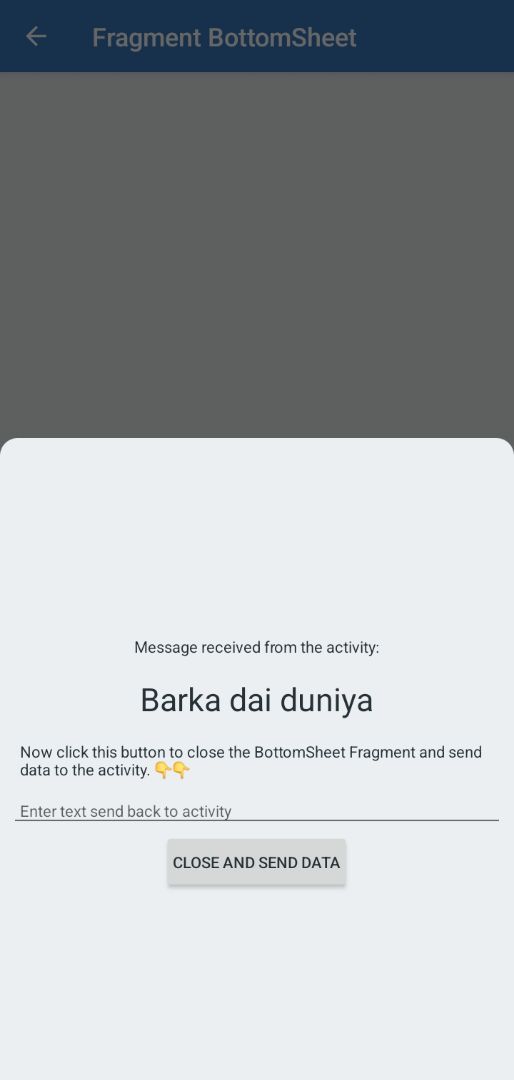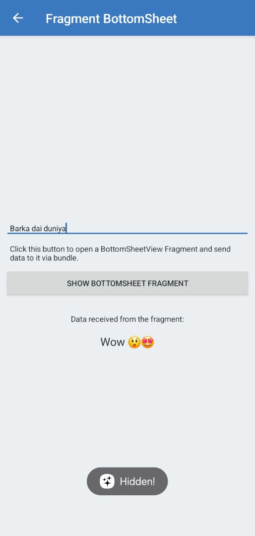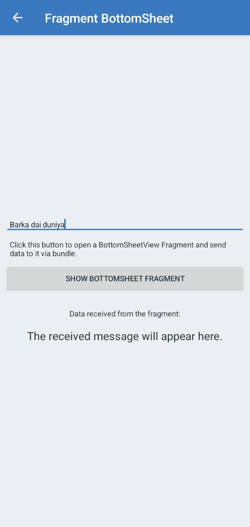 This app demonstrates a simple implementation of a BottomSheetDialogFragment in Android, showcasing two-way communication between an activity and a bottom sheet fragment using bundles.