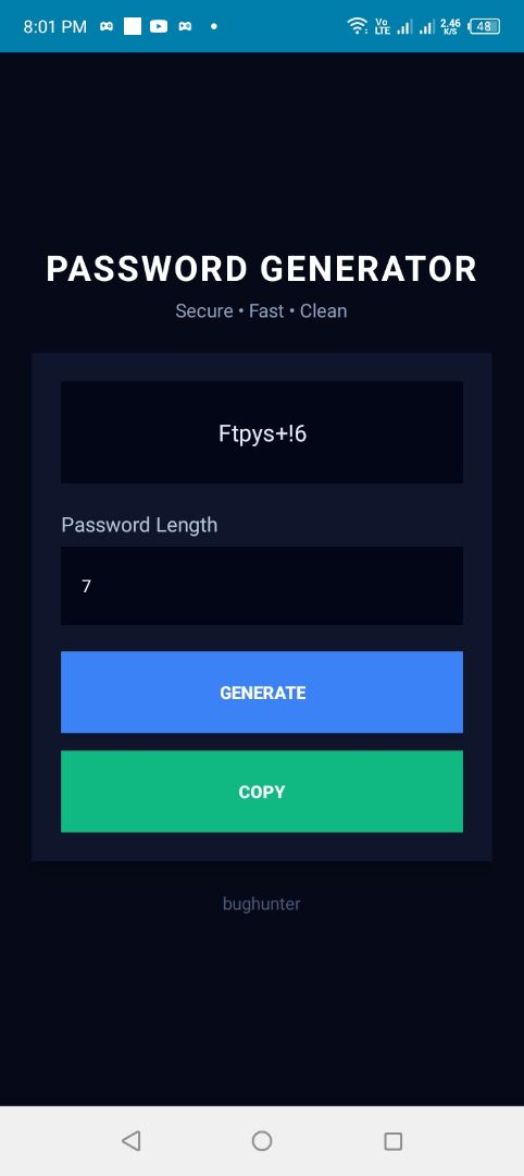 Secure Password Generator helps you create powerful passwords in seconds. Designed with a clean interface and strong randomization for better protection of your accounts. Features: • Generate highly secure random passwords • Custom length control (8–32) • One-tap copy to clipboard • Lightweight and fast • Works offline • Clean dark UI Built for simplicity, speed, and security.