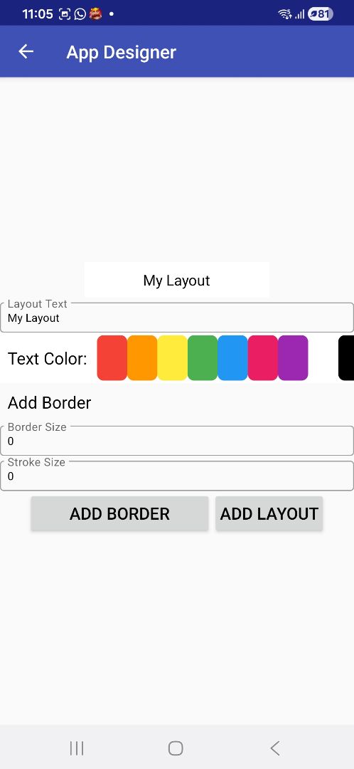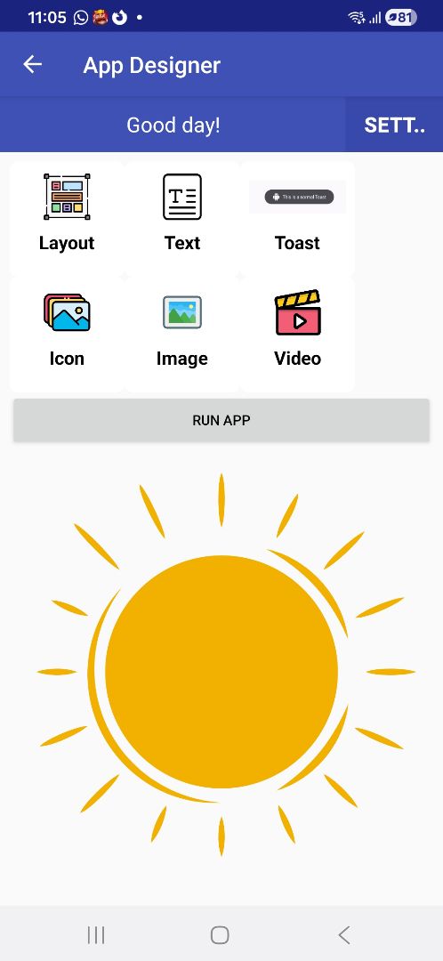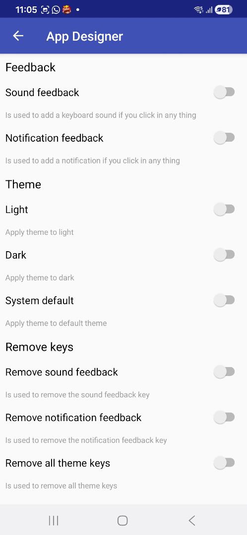 This is a app how you design your app "add toast, image, video, icon etc." and have a setting how you change the app theme, add feedbacks and remove keys.