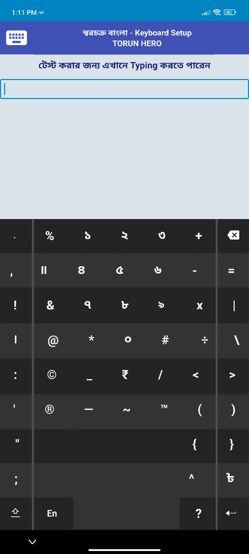 TorunHero Keyboard সেই প্রিয় বাংলা ভাষাকে আরো সহজ ও স্বাচ্ছন্দ্যে ব্যবহার করার জন্য তৈরি করা হয়েছে। এটি একটি স্মার্ট ও লজিক্যালভাবে সাজানো বাংলা কিবোর্ড, যা নতুন ব্যবহারকারীদের জন্যও সহজ এবং দ্রুত টাইপিংয়ের সুবিধা দেয়।