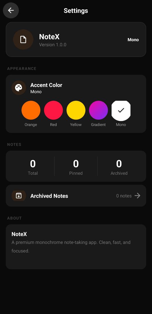 ✅ Monochrome Design ✅ Accent Color System ✅ Markdown Support ✅ Archive Feature ✅ App Shortcuts ✅ SQLite Database ✅ Auto Save ✅ Categories ✅ Note Statistics ✅ Professional UI