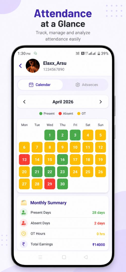 π Key Features β Easy Attendance Tracking Mark Present, Absent, and OT with just one tap π Monthly Reports Get detailed summaries with earnings, attendance, and performance π° Salary Management Automatically calculate daily wages and total earnings π Smart Calendar View Visual attendance tracking with color indicators π³ Advance Management Add and track salary advances easily π€ Worker Profiles Store worker details like name, phone, and daily wage