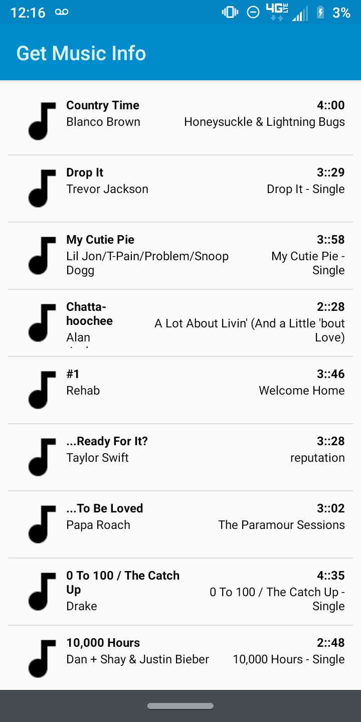 Allows users to get track info artist info album info and duration of song stored on your Android device