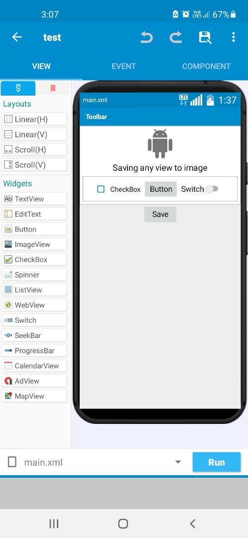 It just saves the view to imageview. There is a moreblock named viewToImage which you may export to your project without worring about any codes. btw i got the code from stackoverflow